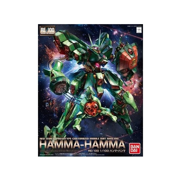 The AMX-103 Hamma-Hamma from “Mobile Suit Gundam ZZ” joins the RE/100 lineup from Bandai! This spectacular kit is fully posable upon assembly, and replicates its distinctive wire-guided Beam Claw weapon and its ornate shield. It’s molded in color with snapfit assembly, and stickers are supplied for the markings. Includes the Hamma-Hamma’s giant shield, 2 beam sabers, and 4 display bases for its arms.